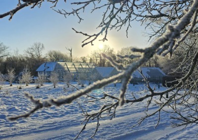 In the orchard, apple trees are planted in espaliers, arches, and as free-standing trees. The apple varieties are specially selected for their connection to Gråsten. In the apple grove, visitors can enjoy their own food and drinks, and one of the old apple trees that has grown here for generations still stands.